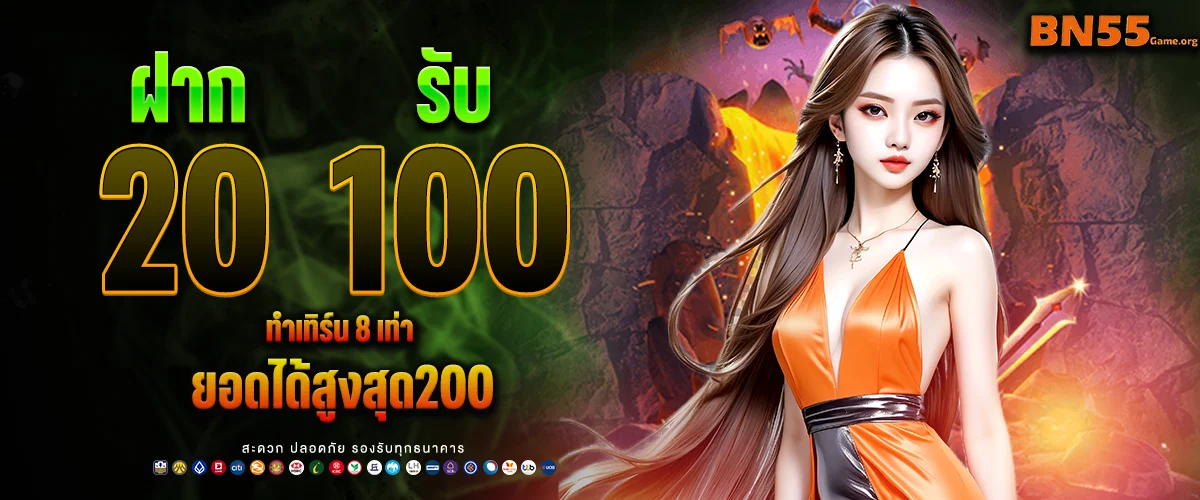 ฝาก 20 → รับเพิ่ม 80 = รวม 100 / ทำเทิร์น 8 เท่า / ถอนได้สูงสุด 200